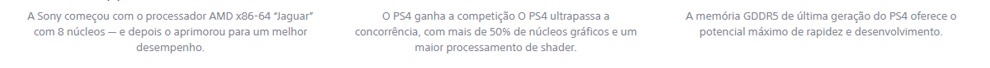 O sistema do PS4 foca nos jogadores, garantindo que os melhores jogos e a experiência mais imersiva seja possível na plataforma. O PS4 é centrado em um poderoso chip personalizado que contém oito núcleos x86-64 e um tecnológico processador gráfico 1.84 TFLOPS com um sistema unificado de memória GDDR5 ultra rápido de 8GB, facilitando a criação de jogos e aumentando a riqueza de conteúdo possível na plataforma.